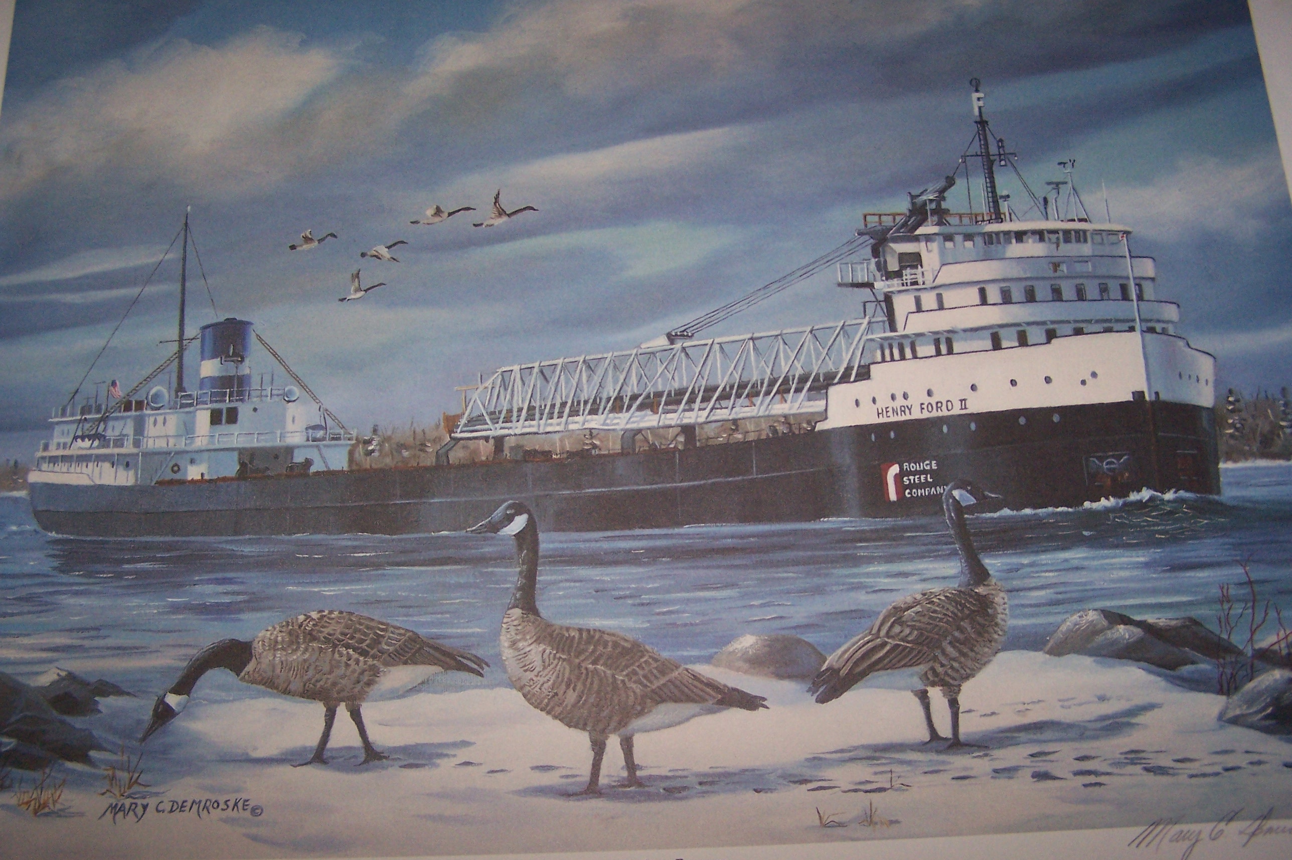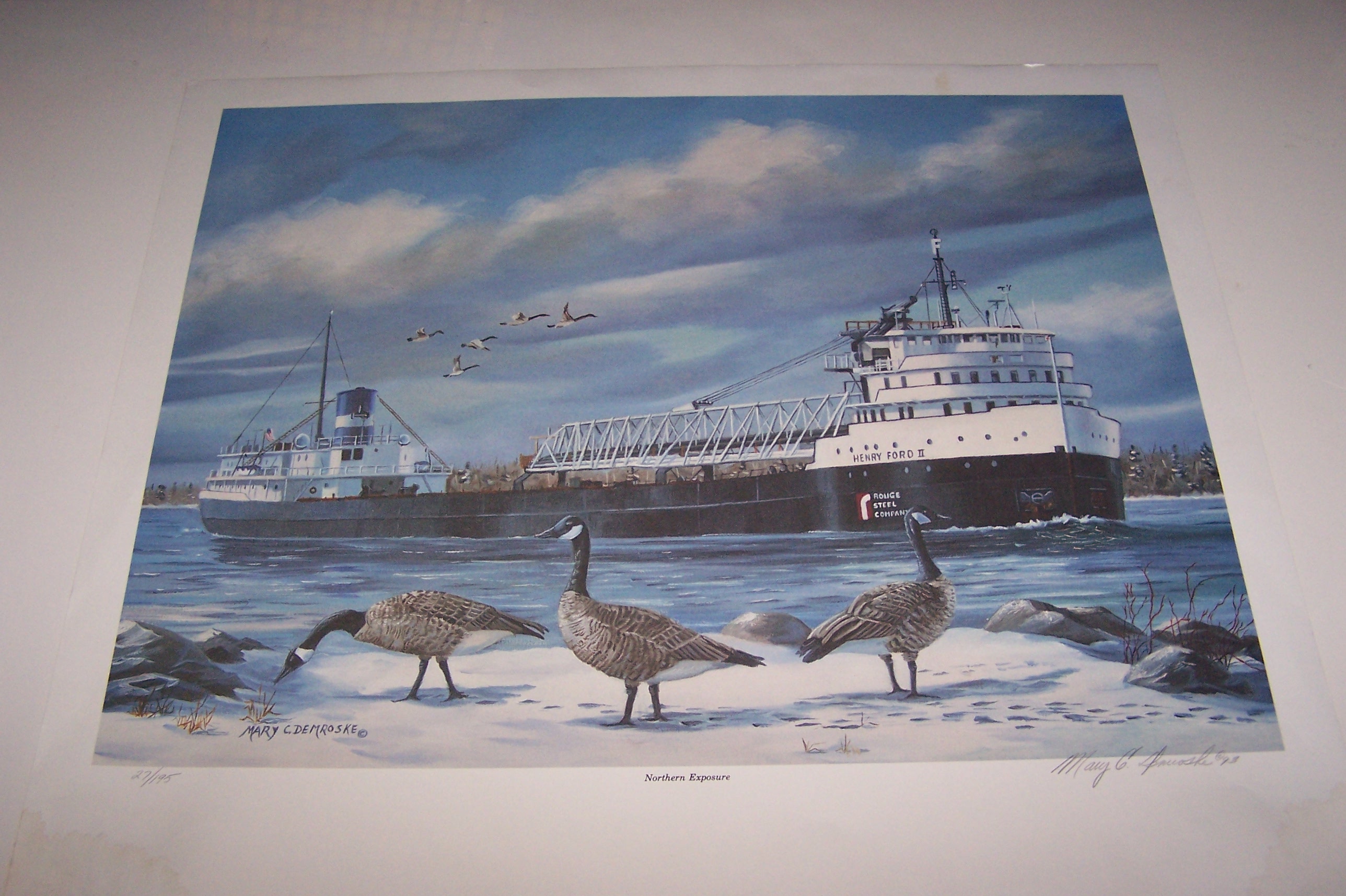 This is print number 27 of 195. It is a very attractive winter scene with several Canada geese in the art. The Ford is in her Rouge Steel Company colors (logo on bow) and has her self-unloading equipment installed.