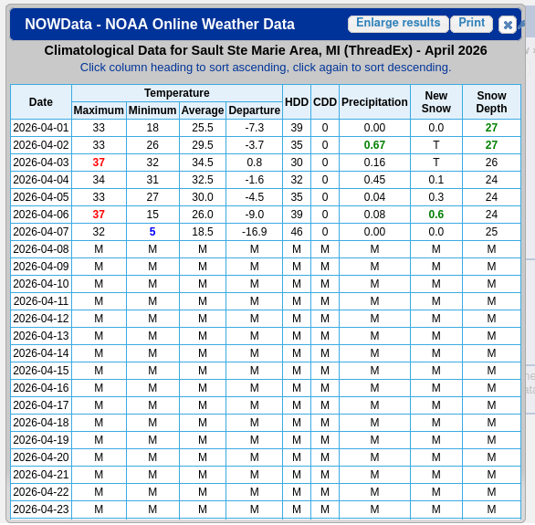 I'm enclosing the climatological daily data from NWS Alpena for Sault Ste. Marie, Michigan. On April 7, 2026 the daily temperature was -16.9 degrees below average.